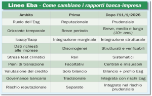 Dal 11 gennaio 2026, tutte le banche europee saranno tenute a integrare in modo strutturale i rischi Esg (ambientali, sociali e di governance) nei propri modelli di gestione, valutazione del rischio e processi decisionali.